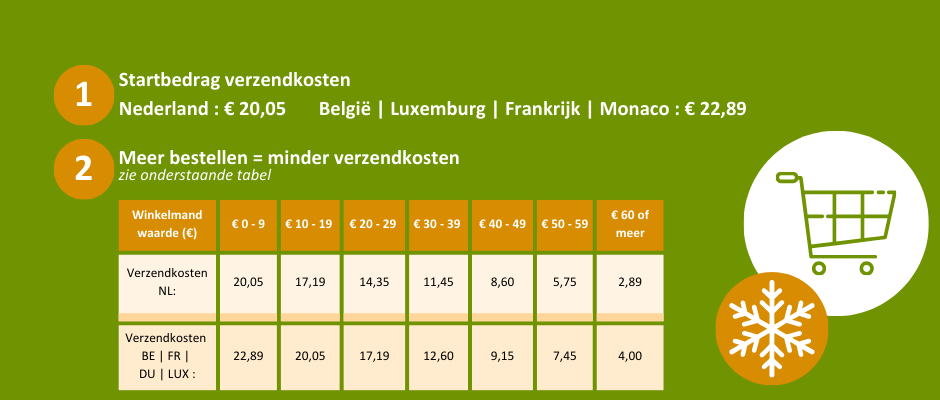 Wanneer je enkel droogwaren besteld, worden deze als pakketpost verzonden. Hiervoor gelden reguliere pakkettarieven (DHL of Bpost).