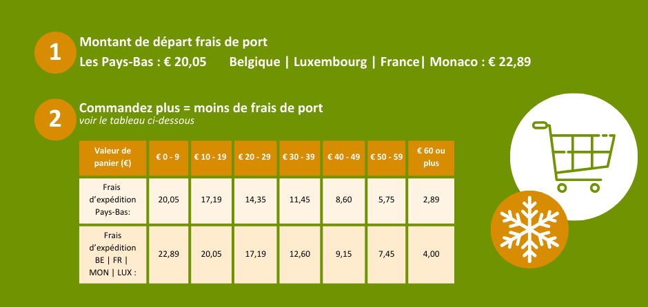 | Commandez au plus tard: | Semaine de livraison | Livraison Belgique (Wallonie)*/** | Livraison France, Luxembourg, Monaco*/** |
